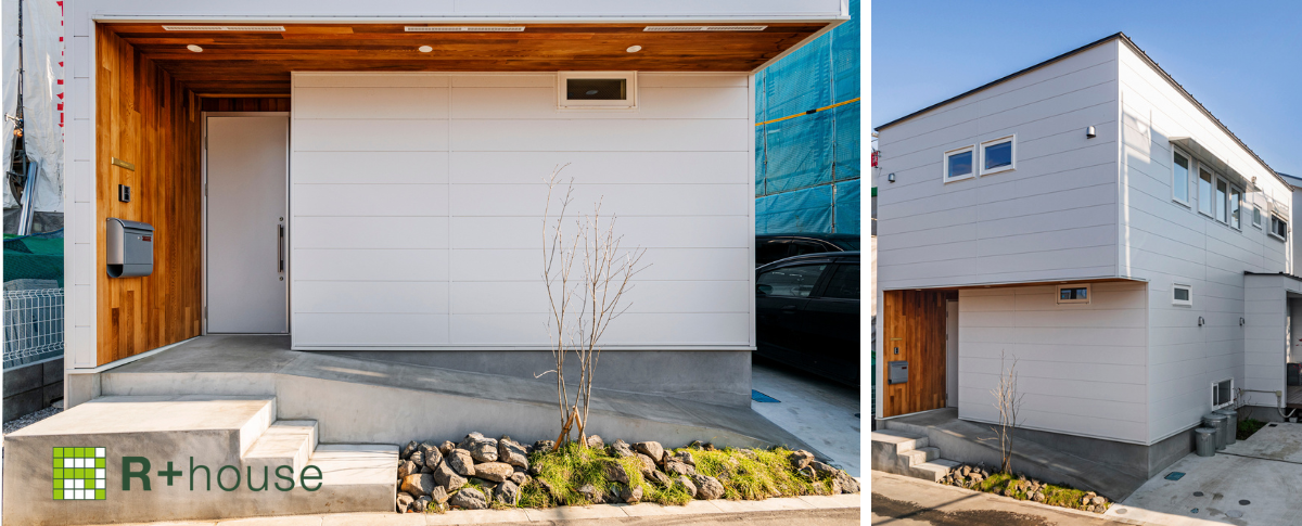 外観は白をメインとしてシンプルし、レッドシダーの壁と軒天が印象的な北欧風のイメージに仕上げました。玄関ポーチに向かう動線にはスロープを配置することで、自転車やお子様のベビーカーなどの出し入れもスムーズになっています。