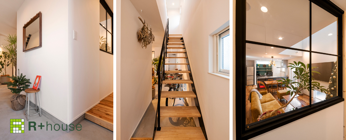 エントランスは多目的な使い方ができる土間スペースとなっております。内と外をつなぐ土間スペースでは自転車を置いたり、植物を置いたり、天候を気にせずに作業ができるなど、趣味を生かした動線にすることで回遊性と楽しさを演出しています。エントランスに室内窓を設置することでつながりのある空間となっています。