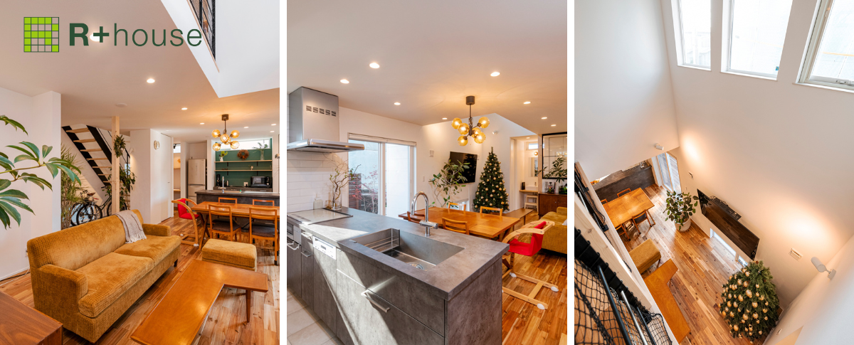 2階の窓から光を採りこむことで外からの視線を気にせずに快適に過ごせる空間を作り出しました。吹き抜けになっているため、開放的な明るいリビングとなっています。また、キッチンから家中が見渡せるので、家事をしながらご家族の様子を確認することができます。