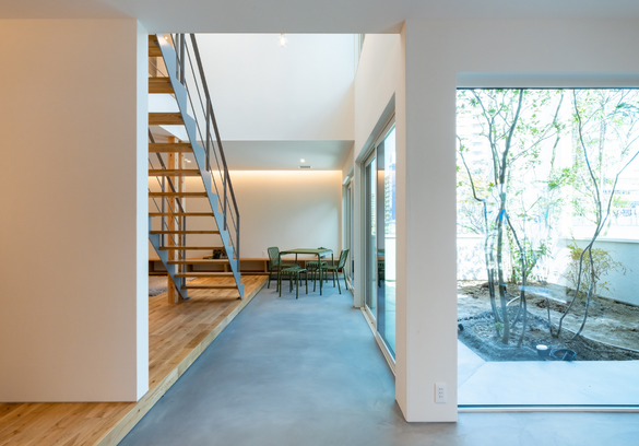 広々とした土間。中庭とのつながりにこだわりました。 開放的な空間を演出しつつ外からの視線を感じさせないプライバシーを確保した中庭はおすすめです。 土間にはアウトドア用品やゴルフバッグ、自転車なども置くことができるので効率的でおしゃれな空間に仕上げる事ができます。