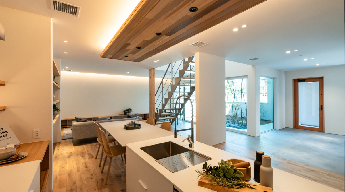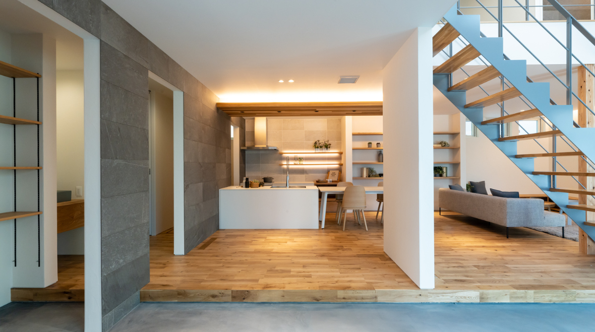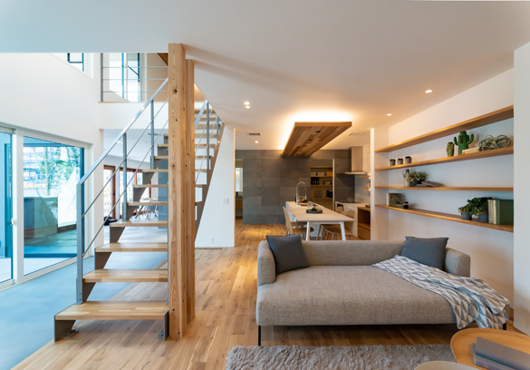 22.5帖のLDK。無駄な壁もなく鉄骨の階段も1つのインテリアとしておしゃれに仕上げました。 開放的な空間には高性能が必須。性能が低いと開放的な空間を快適な温度にするのに電気代がかかります。 高性能の専門家である健康住宅だから実現したLDKをご体感ください。