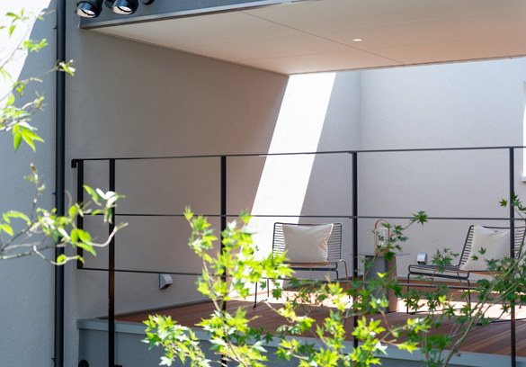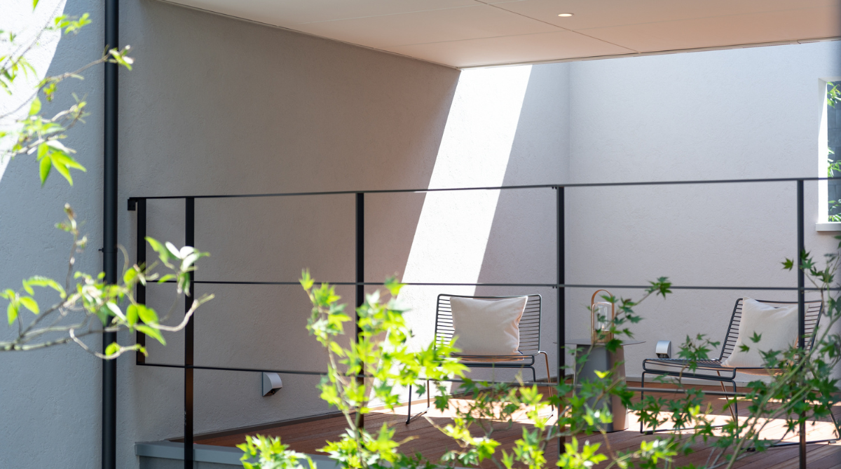広いバルコニーからは、1階とは違った目線で中庭の自然を直に感じることができます。また、バルコニーからだけではなく2階全体で中庭を囲んでいるので室内のどこにいても自然を感じられます。