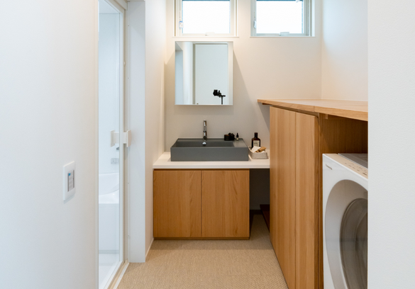 洗面所と脱衣所を一体にしており、隣に浴室があるので家事動線が非常に短く済み、時短につながります。洗面脱衣室だけで、洗濯を完結できる工夫も。浴室を2階に設けたことで寝る前の一連の動作を2階で完結できるのも魅力のひとつです。